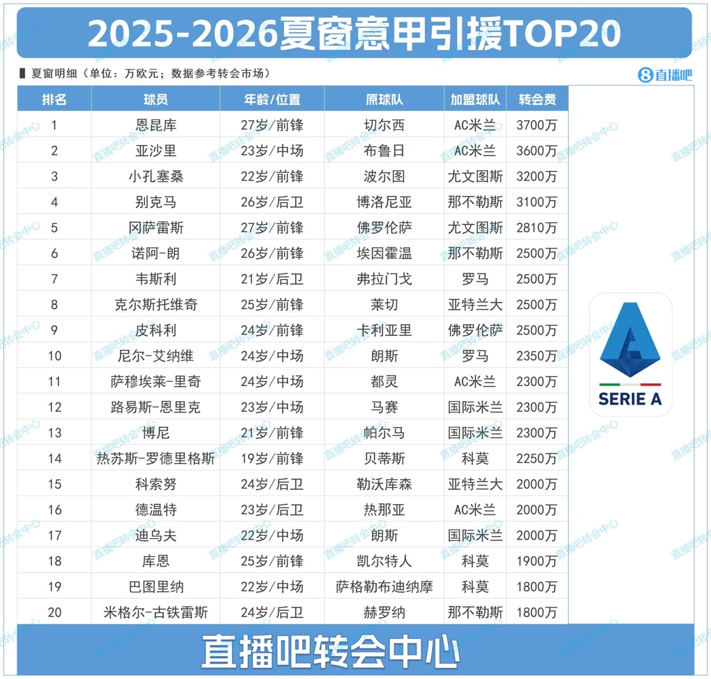 意甲夏窗TOP20:米兰包揽前二,恩昆库3700万标王&亚沙里3600万