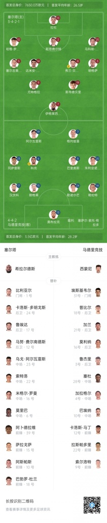 塞尔塔替补:1-比利亚尔、12-马努·费尔南德斯、17-鲁埃达、24-卡洛斯·多明戈斯、23-乌戈·阿尔瓦雷斯、22-索特洛、16-米格尔·罗曼、6-莫里巴、15-萨拉戈萨、39-阿卜德拉维、18-巴勃罗·杜兰、10-阿斯帕斯、